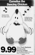 Cornelius The Dancing Chicken is an animated plush chicken toy that was made in 1997-1999, and remade in 2001. He bobs his head side to side and opens and closes his beak to the song "Chicken Dance". When Cornelius is activated, the song starts out in a slow and steady pace, and then plays 2 more times, speeding up each time.