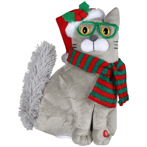 Epic Kitty (Deck The Halls) was an animated Christmas decoration made in 2014 - 2019. There were two versions that were made, a grey Epic Kitty with a red and green scarf and a orange tabby Epic Kitty with a red and green scarf. The grey version and wears a red and green scarf and it wears a Santa hat with a holly on it as well as green glasses. It was made from 2014-2018. The orange tabby version wears the same things as the older grey model, except the glasses. It was made in 2019. Unlike the older grey model, he has 4 paws instead of 2. Both versions when activated dance and meow "Deck The Halls".