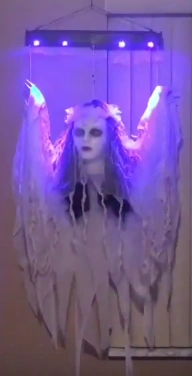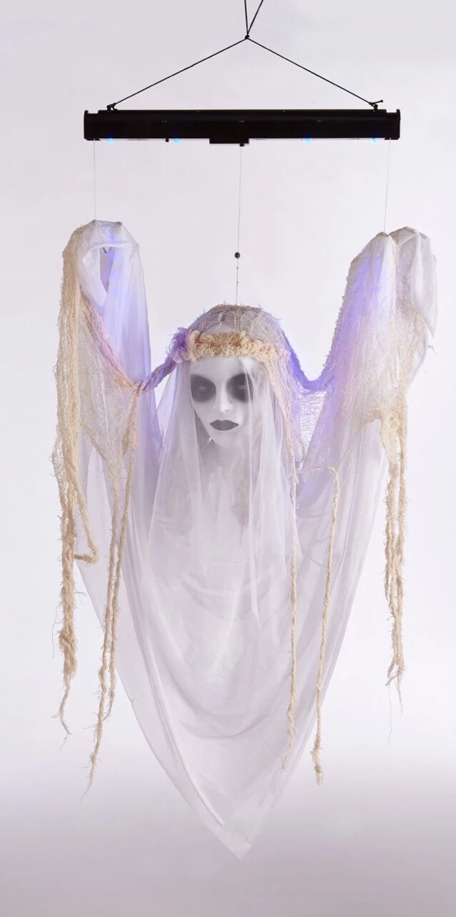 The floating lady is an animated Halloween decoration made in 2017, and is presumed to be a reincarnation of the Floating Ghouls from 2002-2007. The lady is dressed in realistically detailed cloth and gauze, and a flower crown. Her face is white with dark, baggy eyes and bright red lipstick. Her hands are normally covered with cloth however she does have thin hands with long, sharp fingers (the same hands as the Rising Groundbreakers witch, also made in 2017). When activated by button (for in store demo) or sound sensor, the blacklights on the bar flash as the lady floats up and down as she eerily moans and wind howls in the background.