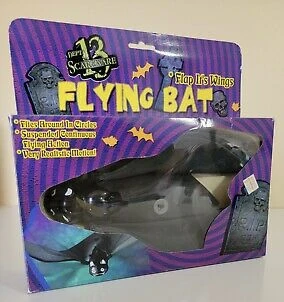 The Flying Bat was an animated Halloween decoration made in 2000 to 2001. (Other companies have continued to make them to the present). It gives the realistic appearance of an actual vampire bat. It comes with a string on its back for hanging from the ceiling. When the switch is set to the "ON" position, the bat flap his wings continuously and flies around in circles until the switch is set to the "OFF" position.