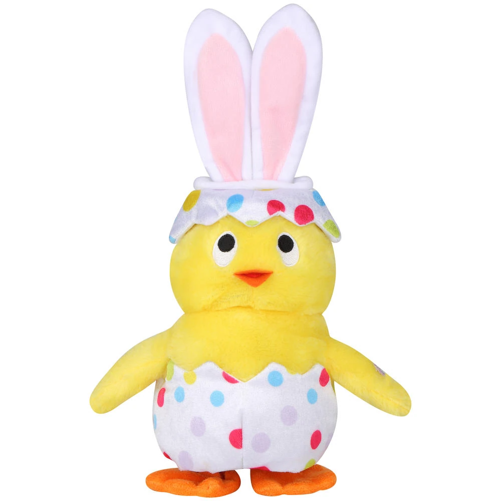 The Hat Raiser Chick is an animated Easter plush made in 2017. The chick wears a colorful eggshell uniform and a matching hat with bunny ears. When activated, he moves his head and wings up and down and he walks while singing "I'm coming out".