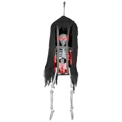 The Shaking Caged Skeleton is an animated Halloween Item made from 2012-2018. It is a skeleton hanging in a cage decorated with shredded gauze details. When activated, the skeleton within the cage shakes violently with glowing red eyes while laughing and screaming. 3 versions were made: the original skeleton was dark grey; the second version is light gray/white and is standing in its cage as opposed to sitting; and the currently sold version is also light gray/white, and sits in the cage.